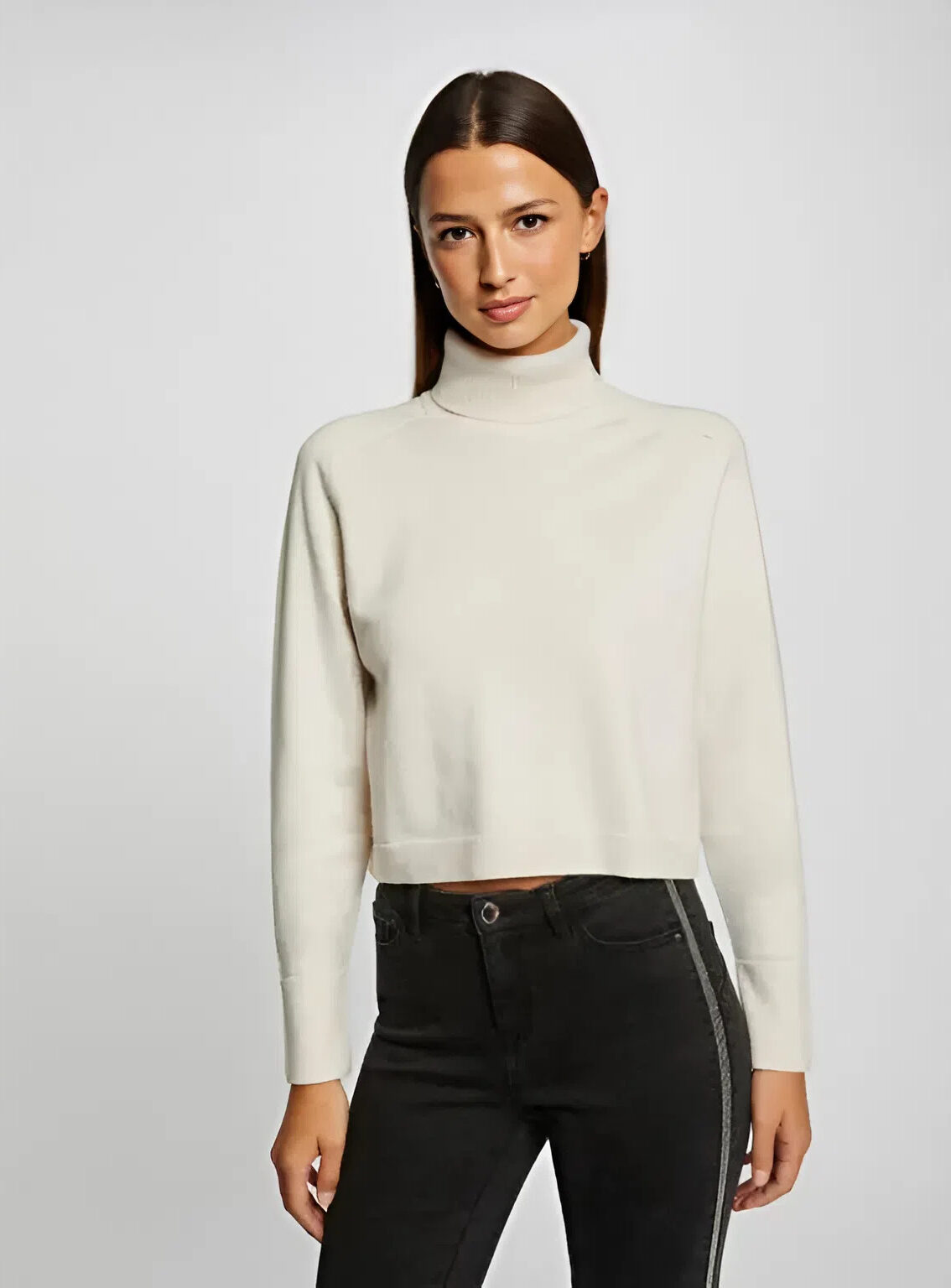 Pull crop col roulé court ivoire, doux et confortable. Style tendance parfait pour l’automne/hiver. Facile à porter avec jeans ou jupes.
